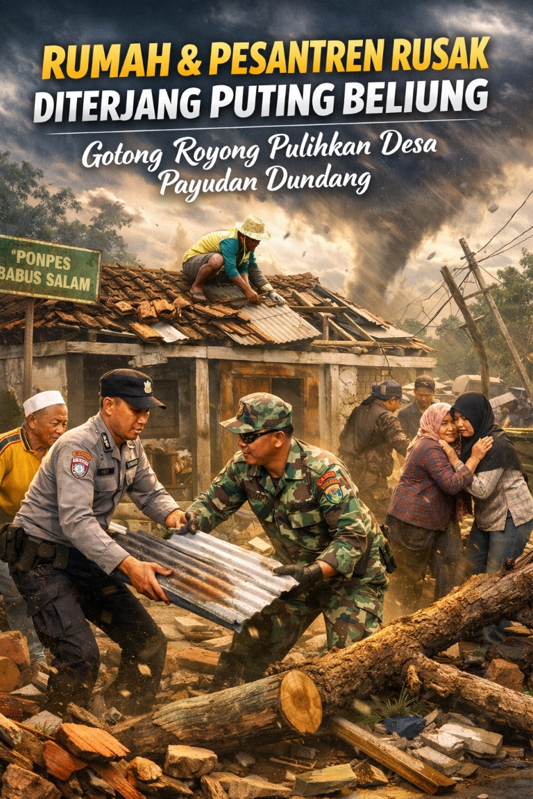 Sumenep,RPN-Cuaca ekstrem kembali melanda wilayah Kabupaten Sumenep. Hujan deras disertai angin puting beliung menerjang Desa Payudan Dundang, Kecamatan Guluk-Guluk, Senin (22/12/2025) sekitar pukul 14.00 WIB. Peristiwa tersebut menyebabkan sejumlah rumah warga dan satu pondok pesantren mengalami kerusakan, serta pohon tumbang yang sempat menghambat akses jalan desa.