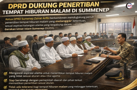 Sumenep,RPN-Keberadaan tempat hiburan malam di Kabupaten Sumenep kembali menjadi perhatian publik. Sejumlah elemen masyarakat, khususnya kalangan ulama yang tergabung dalam Gerakan Umat Islam Sumenep, mendorong pemerintah daerah untuk melakukan penertiban terhadap aktivitas hiburan malam yang dinilai tidak sejalan dengan karakter religius daerah tersebut.