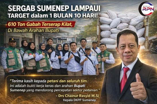 Sumenep,RPN-Kabupaten Sumenep kembali mencatatkan prestasi gemilang di sektor pertanian. Setelah sukses mempercepat target swasembada pangan dari tiga tahun menjadi hanya satu tahun, kini Dinas Ketahanan Pangan dan Pertanian (DKPP) setempat berhasil melampaui target Serapan Gabah (Sergab) dengan capaian signifikan.