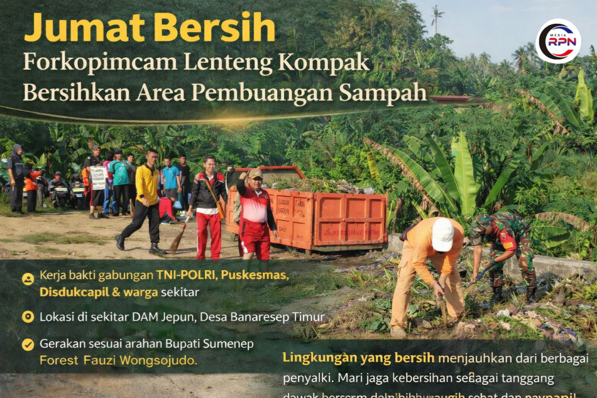 SUMENEP,RPN- Semangat gotong royong kembali ditunjukkan jajaran Forum Koordinasi Pimpinan Kecamatan (Forkopimcam) Lenteng dengan menggelar kegiatan kurvei atau kerja bakti pembersihan lingkungan pada Jumat pagi (10/04/2026).