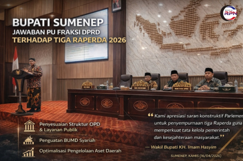 Sumenep,RPN-Pemerintah Kabupaten Sumenep menegaskan komitmennya dalam memperkuat tata kelola pemerintahan dan mendorong pertumbuhan ekonomi daerah melalui tiga Rancangan Peraturan Daerah (Raperda) tahun 2026. Hal itu disampaikan dalam Rapat Paripurna DPRD dengan agenda Jawaban Bupati atas Pandangan Umum (PU) Fraksi-Fraksi, Kamis (16/04/2026).