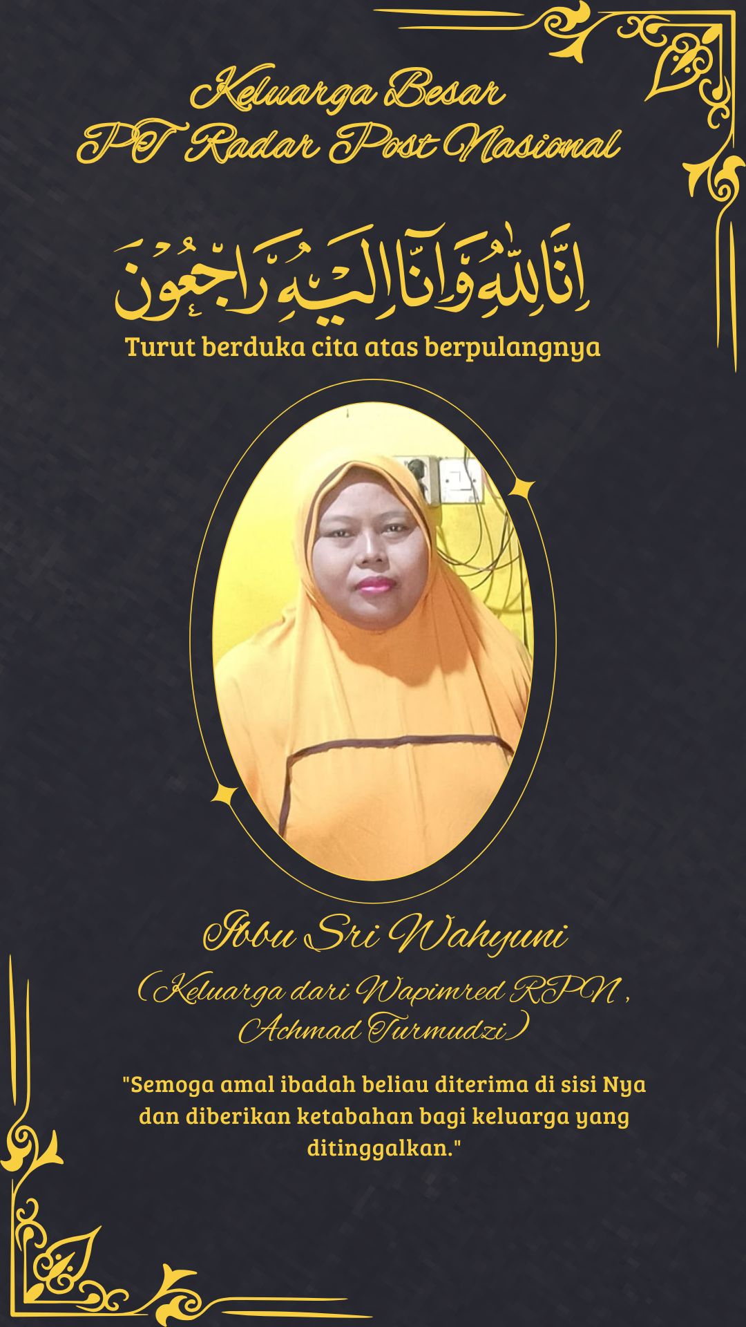 Kami segenap keluarga besar PT Radar Post Nasional (RPN) mengucapkan belasungkawa yang sedalam-dalamnya atas berpulangnya ke rahmatullah Ibu Sri Wahyuni, keluarga dari Wakil Pimpinan Redaksi (Wapimred) RPN, Bapak Achmad Turmudzi pada Sabtu (15/03/2025).