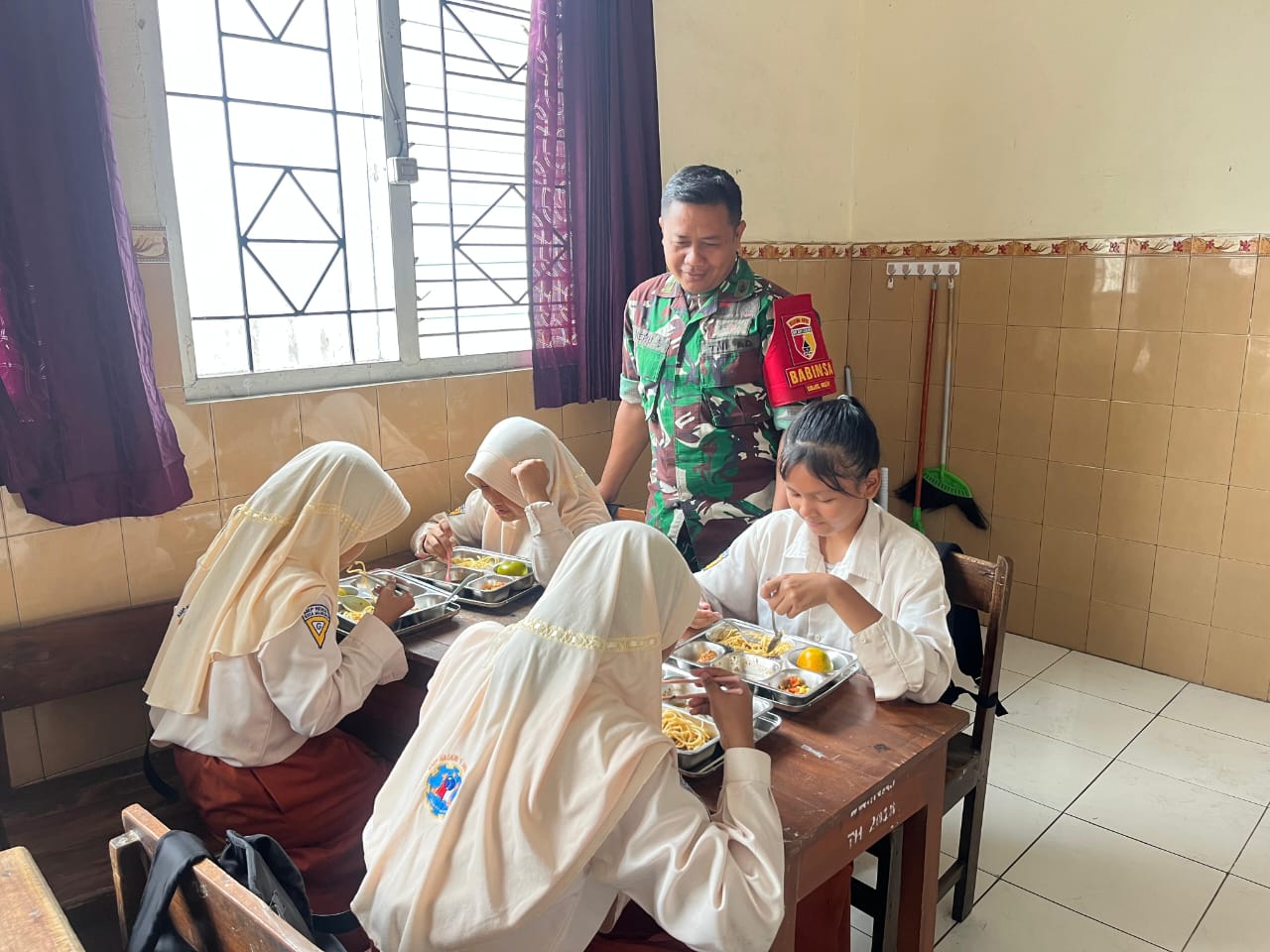 Suasana penuh keceriaan tampak di setiap sekolah saat para siswa menikmati menu bergizi yang telah disiapkan. Babinsa bersama para guru turut mendampingi proses makan bersama, menumbuhkan semangat kebersamaan sekaligus mengedukasi pentingnya pola makan sehat.(Whab)
