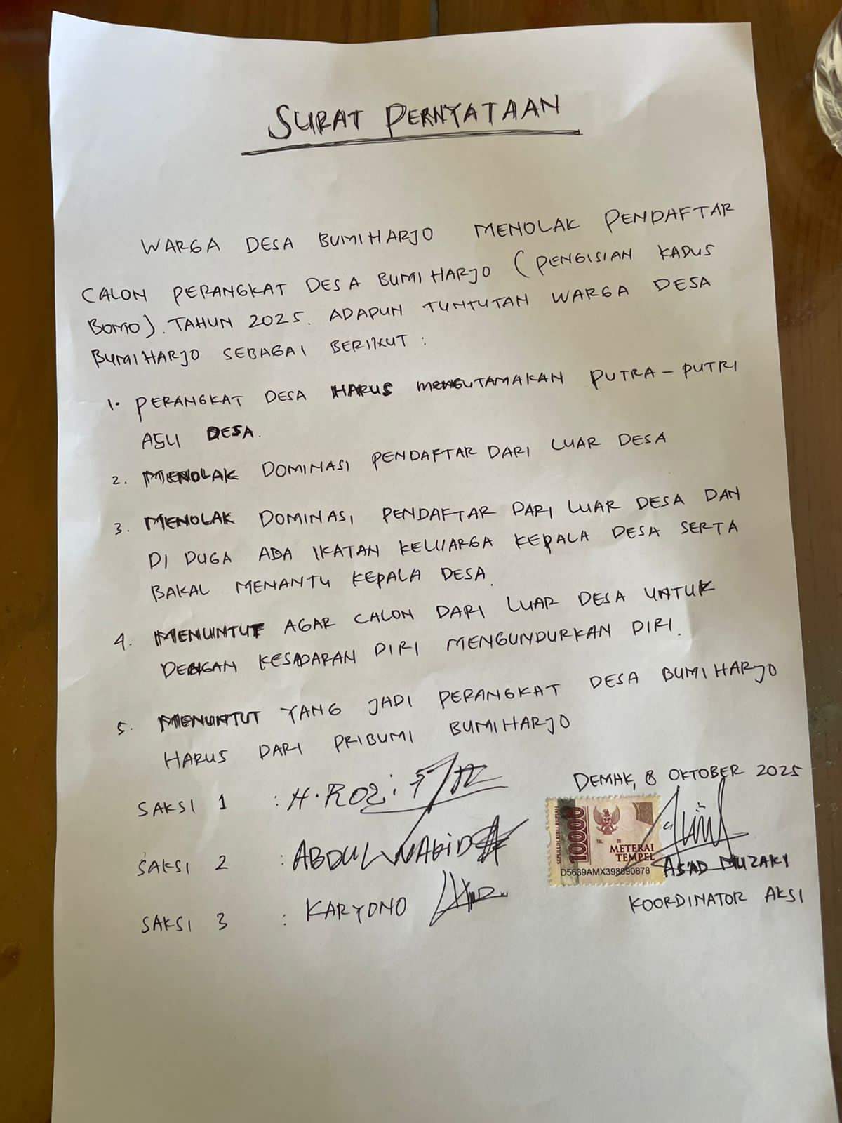 Pernyataan sikap itu tertuang dalam sebuah surat pernyataan warga Desa Bumiharjo, tertanggal 8 Oktober 2025, yang ditandatangani oleh sejumlah saksi dan koordinator aksi bernama As’ad Duzaki. Dalam surat tersebut, warga menyampaikan lima tuntutan utama kepada panitia seleksi perangkat desa.