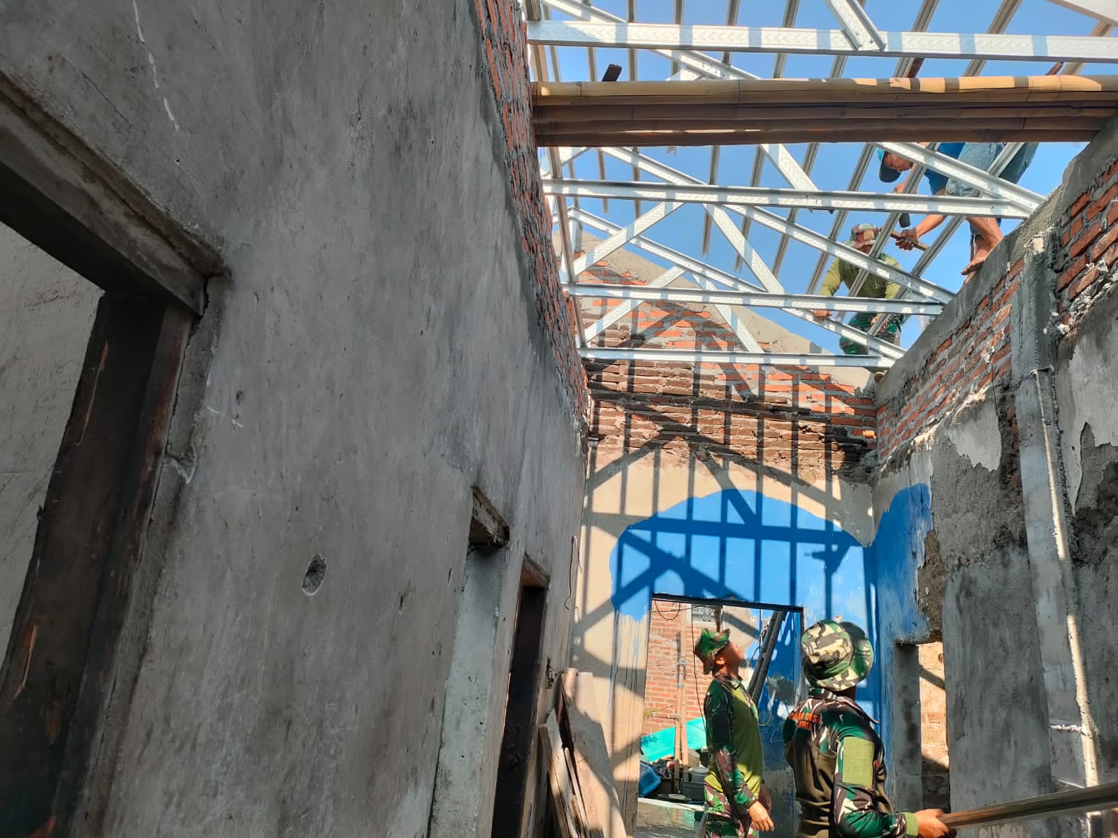 Di bawah teriknya matahari, anggota Satgas TMMD bersama warga setempat tampak bekerja bahu-membahu memasang rangka atap dengan penuh kehati-hatian. Aktivitas gotong royong ini menjadi wujud nyata sinergi TNI dan masyarakat dalam mewujudkan rumah yang layak, aman, dan nyaman bagi warga yang membutuhkan.