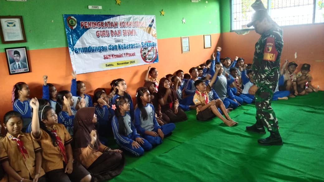 Mojokerto,RPN-Upaya menciptakan lingkungan belajar yang aman dan nyaman bagi anak terus digencarkan melalui kegiatan sosialisasi edukatif. Anggota Koramil 0815/16 Pacet Kodim 0815/Mojokerto, Serka Supriyanto, menjadi narasumber dalam kegiatan sosialisasi tentang perundungan (bullying) dan kekerasan seksual terhadap anak di SDN Kemiri 1, Desa Kemiri, Kecamatan Pacet, Kabupaten Mojokerto, Jawa Timur, Sabtu (08/11/2025).